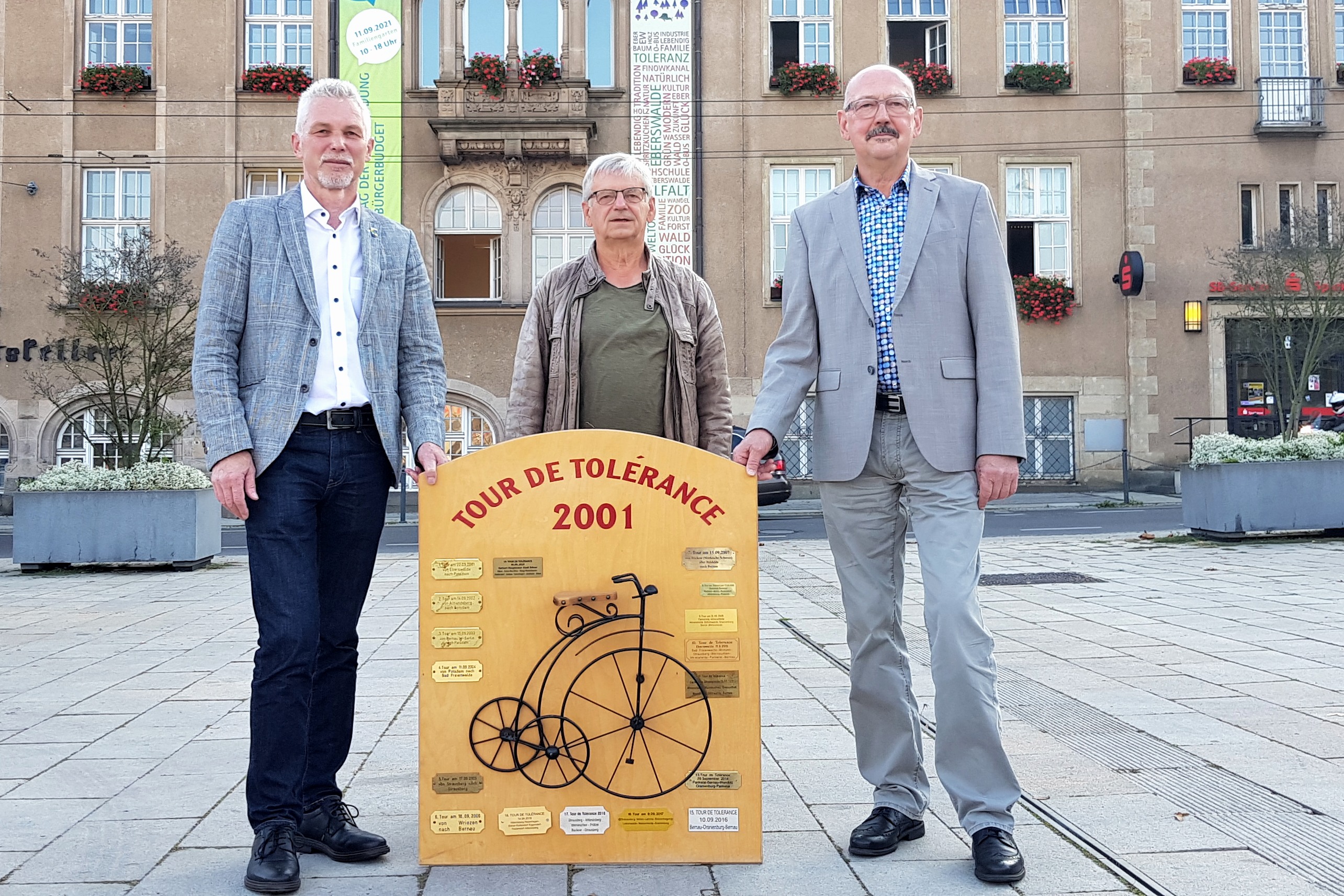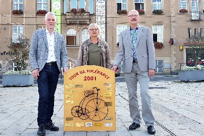 Heute morgen pünklich um 8.00 Uhr kam der Staffelstab der Tour de Tolérance in Eberswalde an. Der Erkneraner Bürgermeister Henryk Pilz ließ es sich nicht nehmen, die Tafel mit dem symbolischen Fahrrad auf dem Marktplatz von Eberswalde an den dortigen Bürgermeister, Friedhelm Boginski, zu übergeben. Gern erinnere er sich an die letztjährige Tour Rund um Erkner, bei der er selbst mitgefahren sei. Besonders wichtig waren ihm die vielen interessanten Gespräche während der Fahrt mit den Teilnehmern über ein tolerantes Miteinander. |