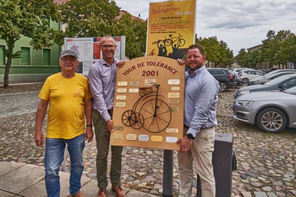 Punkt 13.00 Uhr kam er an, der „Staffelstab“ der Tour de Tolérance. Obwohl, eigentlich ist es ja kein richtiger Staffelstab – das stilisierte Fahrrad auf einer Sperrholztafel begleitet die Tour für ein tolerantes Miteinander schon seit ihrer ersten Auflage im Jahr 2001.