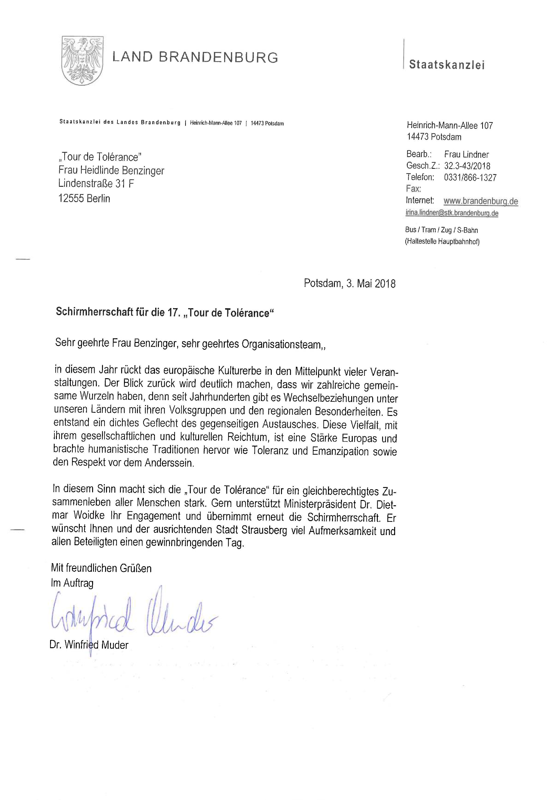 In diesem Sinn macht sich die „Tour de Tolerance" für ein gleichberechtigtes Zusammenleben aller Menschen stark. Gern unterstützt Ministerpräsident Dr. Dietmar Woidke Ihr Engagement und übernimmt erneut die Schirmherrschaft. Er wünscht Ihnen und der ausrichtenden Stadt Strausberg viel Aufmerksamkeit und